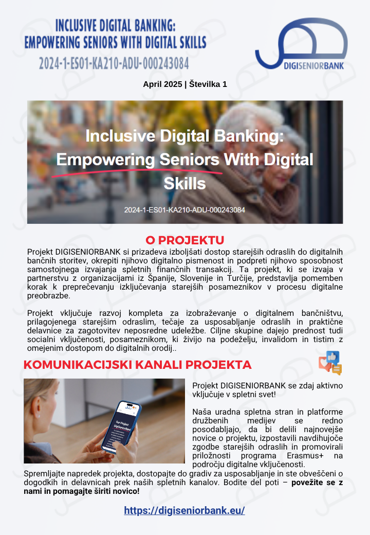 Cilj projekta je opolnomočiti starejše odrasle z digitalnimi veščinami, spodbujati finančno in socialno vključenost ter povečati zaupanje pri uporabi spletnih bančnih storitev.